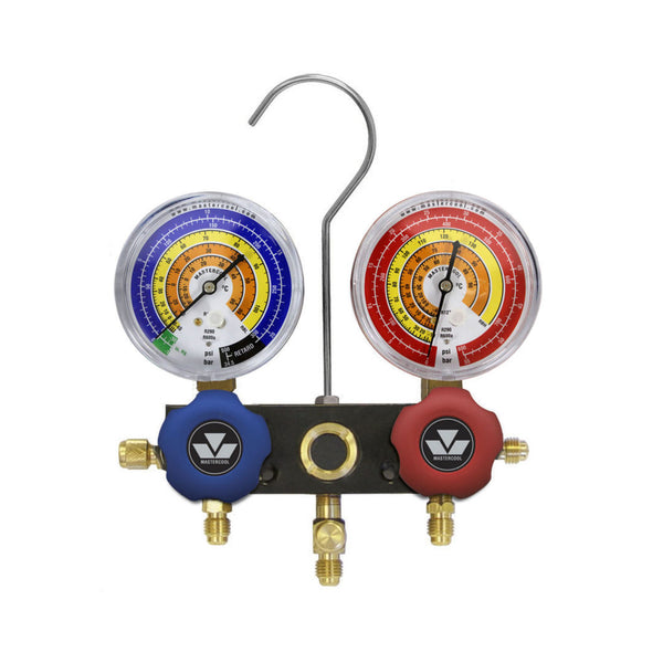 This 2-way manifold set connects to both high and low side service ports, allowing for charging, evacuation, and pressure checks—no hose swapping needed during the job.