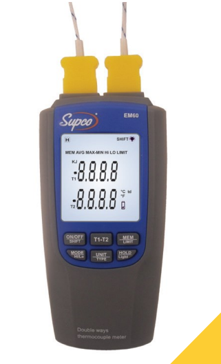 The Supco EM60 is a dual-channel (J/K) differential thermometer built for HVAC/R techs who need fast delta-T checks on coils, ducts, and line sets. It compares T1, T2, and T1-T2 in real time, so you can diagnose performance quicker and avoid call-backs — fair dinkum, it’s a ripper for everyday service work.