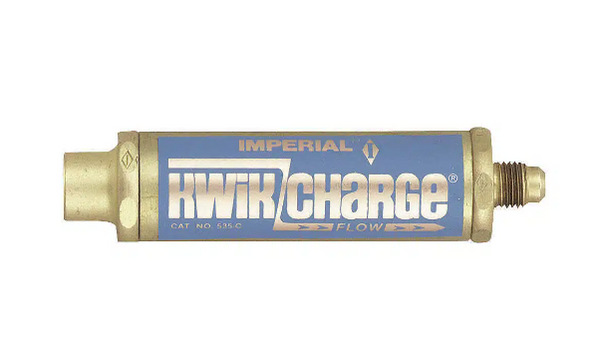 The Kwik Charge® charging unit accepts liquid refrigerant from the cylinder and discharges into the low side of the system. The charging rate is up to eight times faster than vapour charging. In addition, liquid charging is required when using R-410A and other blended refrigerants. Attach the Kwik Charge device to the low side of the charging manifold. The charging hose is connected from the Kwik Charge device outlet to the low side of the refrigeration system. The internal metering element reduces liquid flow to a level below the capacity of the compressor. This assures a safe, fast charge without endangering the compressor. A built-in ball check valve automatically opens when drawing a vacuum to assure rapid, unrestricted evacuation. Can be used with all fluorinated hydrocarbon refrigerant systems.