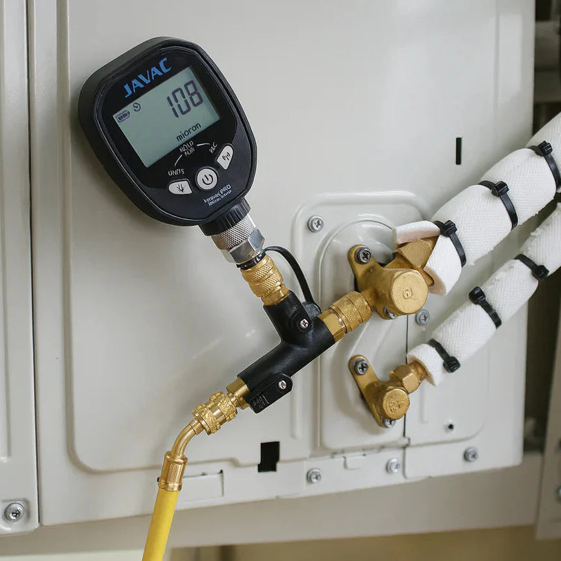 Tradie Pro Tip for Fast Evacuations:A standard Schrader valve restricts your vacuum pump's flow by up to 90%. By using this Javac tool to remove the core, connecting your heavy-duty vacuum hose directly to the 1/4" MSAE rear port, and mounting your micron gauge on the isolated side port, you will pull a deep 500-micron vacuum in a fraction of the time. Once the system is dry, simply isolate the pump and push the core back in under vacuum!