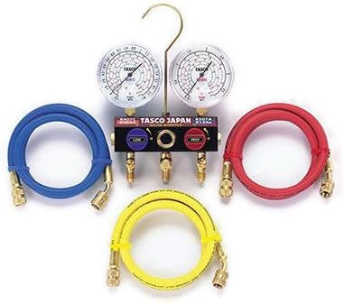 The Tasco TA124W‑EXP is a robust, oil‑resistant ball‑valve manifold kit with handy sight glass, smooth quarter‑turn valves, and accurate gauge assembly—perfect for servicing HVAC systems using R407C, R404A, R507A, or R134a where mobility and speed matter.
